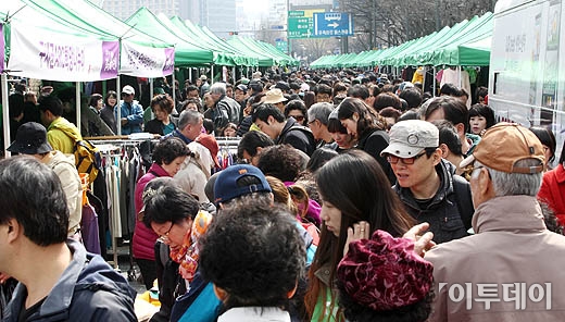 17일 서울 광화문광장에서 열린 시민이 참여하는 대규모 벼룩시장 '희망나눔장터'가 시민들로 붐비고 있다. 희망나눔장터는 서울시가 주관하고 시민들이 직접 참여해 꾸미는 이색장터로 오는 10월까지 매주 일요일마다 광화문광장에서 열린다. 방인권기자 bink7119@