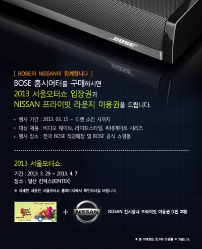이번 행사는 오는 29일부터 시작되는 서울모터쇼에 보스가 닛산의 파트너사로 참여하는 것을 기념해 마련했다. 이벤트 대상 제품은 홈시어터 제품군인 비디오웨이브, 라이프스타일 시리즈, 씨네메이트 시리즈 등 총 9품목이다. 선착순 구매자 100명에 한해 모터쇼 입장권 및 닛산 프라이빗 라운지 초대권(1인 2매)을 증정한다.