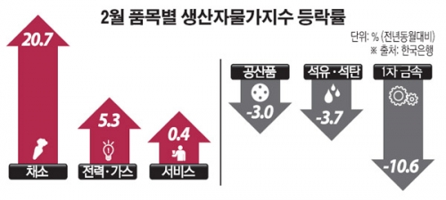 품목별로는 농림수산품이 5.2% 떨어졌다. 채소는 20.7% 올랐지만 축산물 14.0%, 과일류가 23.1%씩 내렸다. 공산품도 3.0% 떨어졌다. 특히 1차 금속제품(-10.6%)의 하락세가 두드러졌다. 석탄·석유제품은 3.7% 떨어졌다. 대신 전력·가스·수도 물가는 5.3%, 서비스 물가는 0.4% 올랐다.