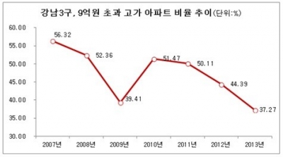 2013년 현재 강남3구 전체 26만4868가구 중 9억원 초과 아파트는 9만8709가구로 고가 아파트 비율이 37.27%를 기록했다. 이는 2007년 이후 최저치인 데다 9억원 초과 가구 수 또한 2007년 이후 처음으로 10만가구 밑으로 떨어졌다.