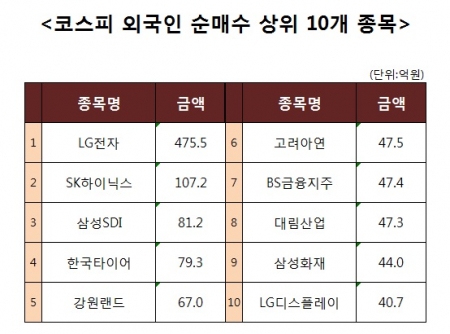 [코스피 외국인 순매수 상위 10개 종목]