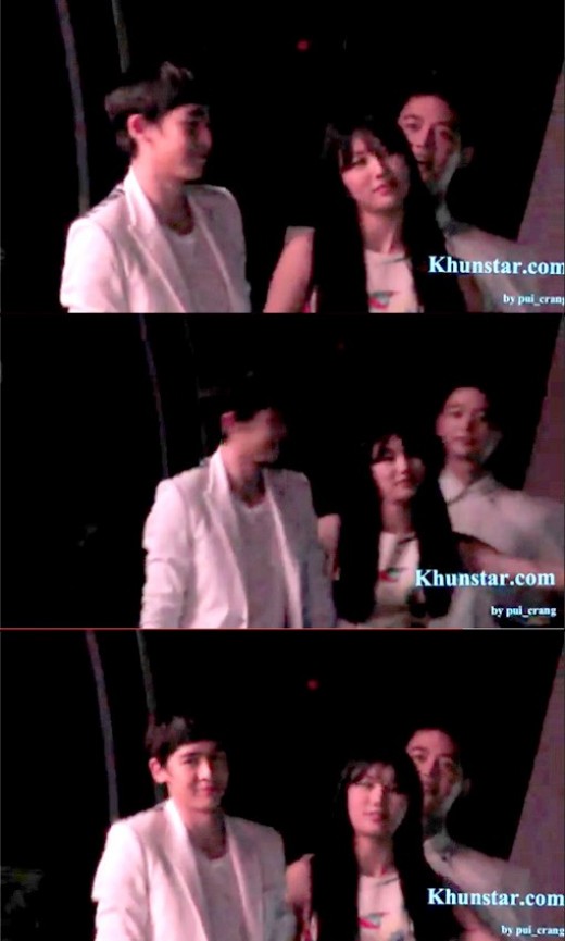 사진 속에서 미쓰에이 수지는 '제3회 MBC 코리안 뮤직 웨이브 인 방콕 2013' 무대를 마치고 무대 뒤에서 2PM 닉쿤을 만나 인사를 나누고 있다.