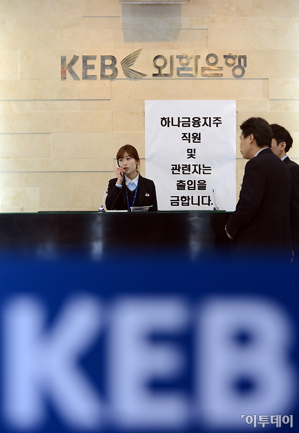 서울중앙지검 금융조세조사1부가 19일 오전 종로구 외환은행 본점에 압수수색을 들어간 가운데 로비에서 직원들이 근무를 서고 있다. 노진환 기자 myfixer@