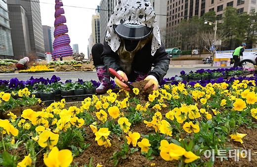 봄의 한 가운데로 성큼 다가선 19일 서울 청계광장에서 인부들이 봄꽃을 심고 있다.