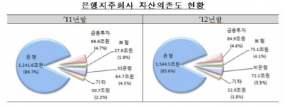 이에 금융지주사 은행에 대한 수익 의존도는 갈수록 고착화되는 것으로 확인됐다. 업종별 이익기여도는 은행부문이 83.6%로 전년 78.9% 대비 크게 증가했다. 농협지주 신설과 하나지주의 외환은행 인수 등으로 은행권역의 손익이 증가한데 주로 기인한 것으로 풀이된다.