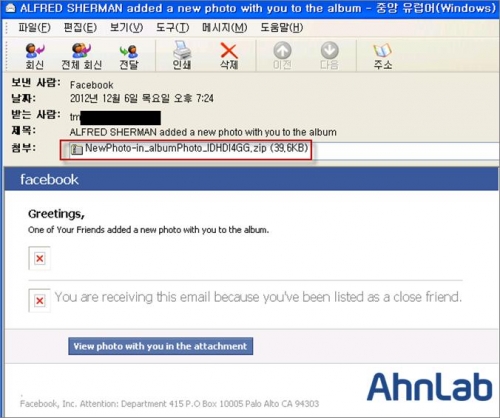 안랩의 월간 보안 보고서인 ASEC리포트 최신호에 따르면 ‘당신과 함께 찍은 사진을 업로드 했다(ALFRED SHERMAN added a new photo with you to the album)’라는 제목의 이 악성메일의 발신자는 자세한 주소 없이 ‘페이스북(Facebook)’으로만 표시돼 있다. 본문에는 “새로운 사진이 앨범에 등록되었으니 확인하려면 첨부된 파일을 확인하라(One of your friends added a new photo with you to the album, View photo with you in the attachment)”는 내용이 적혀있다. 첨부된 zip파일의 압축을 풀면 ‘NewPhoto-in_albumPhto_.jpeg.exe’라는 그림 파일을 위장한 실행파일이 나온다.