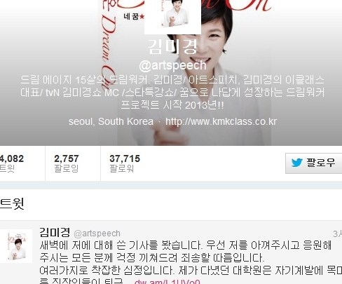 조선일보 보도 직후 비난이 쏟아지자 김미경씨가 자신의 트위터에 해명을 했다. 김씨는 “아끼고 응원해주신 분들께 걱정을 끼쳐 죄송할 따름이다”라는 심경으로 글을 시작했다.