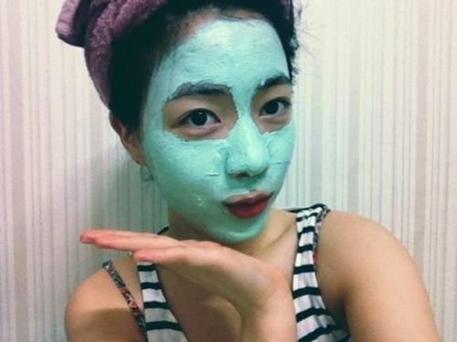 사진 속 효영은 머리에 수건을 두른 채 초록색 팩을 바르고 있다.