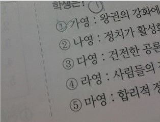 사진에는 학생 이름을 가영 나영 다영 라영 마영 가나다순으로 적은 시험지가 찍혀 있다.