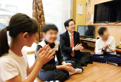 ▲정일영 이사장이 지난달 6일 경기도 안산의 초록 반디의 집을 방문해 아이들과 즐거운 시간을 보내고 있다.