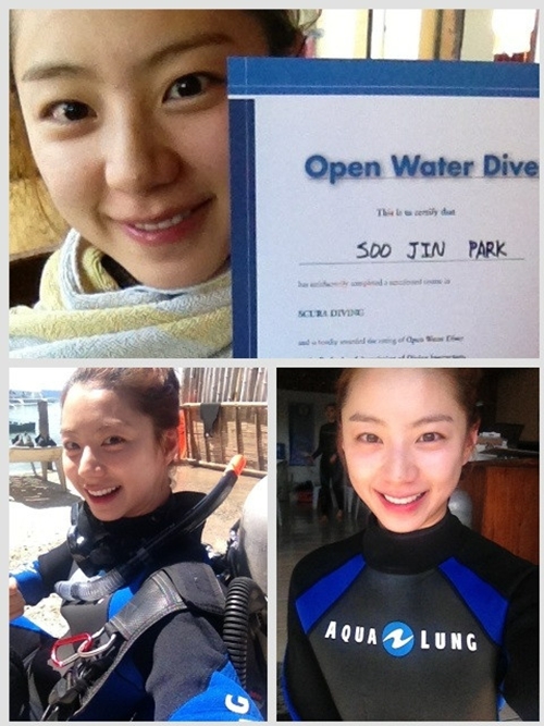박수진은 21일 자신의 트위터에 “오픈워터다이버 자격증 획득♡”라는 글과 함께 사진을 게재했다.