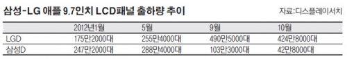 특히 태블릿PC 패널의 약진이 두드러진다. 태블릿PC는 지난 2011년 9%를 차지하며 패널 가운데 매출 비중이 가장 낮았으나 지난해 4분기 TV 다음으로 매출이 높았던 모니터(16%)를 추월했다. 디스플레이서치에 따르면, LG디스플레이는 지난해 10월 ‘아이패드 미니’용 패널 점유율이 무려 77.7%에 달하는 것으로 나타났다. 같은해 3월 88만6000대(24%)에서 7개월 만에 5배나 뛰어오른 셈이다.