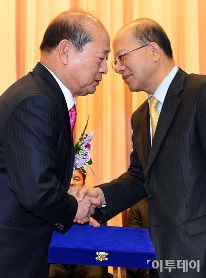 헌법재판소장 권한대행을 맡았던 송두환(왼쪽) 재판관이 22일 오전 서울 종로구 헌법재판소에서 열린 자신의 퇴임식에서 박한철 헌재소장 내정자로부터 감사패를 받으며 이야기를 나누고 있다. 방인권기자 bink7119@