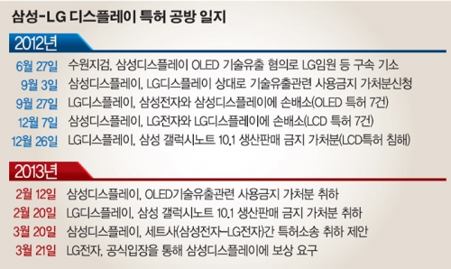 삼성디스플레이 역시 지난 12월 부품사(LG디스플레이)와 세트사(LG전자)에 LCD관련 특허소송을 냈고, 다시 LG는 ‘갤럭시노트 10.1’ 생산판매금지 가처분 신청으로 받아쳤다. 양사가 당초 소송과 관련없는 기술까지 소송을 확대한 셈이다.