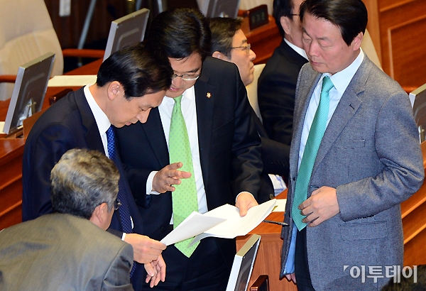여야가 막판 진통 끝에 정부조직법 개정안 등과 관련, 최종협상을 전격 타결한 가운데 22일 오후 여의도 국회 본회의장에서 김기현 새누리당 원내수석부대표(왼쪽 두 번째)와 우원식 민주통합당 원내수석부대표(왼쪽 세 번째)가 이야기를 나누고 있다. 이날 여야는 본회의를 통해 정부조직법 개편과 관련된 40여개의 법안을 일괄 처리할 예정이다. 노진환 기자 myfixer@