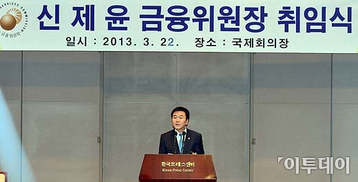 신제윤 금융위원장이 22일 오후 서울 중구 프레스센터에서 열린 취임식에서 취임사를 하고 있다. 방인권 기자 bink7119@
