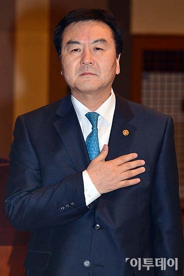 신제윤 금융위원장이 22일 오후 서울 중구 프레스센터에서 열린 취임식에서 국민의례 있다. 방인권 기자 bink7119@