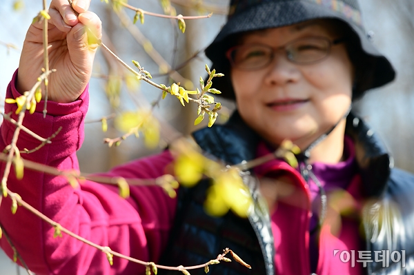 추위가 한풀 꺾이고 완연한 봄날씨를 보이고 있는 24일 서울 상암동 하늘공원 인근에서 시민들이 꽃망울을 피우기 시작한 개나리를 보며 오후를 즐기고 있다. 노진환 기자 myfixer@
