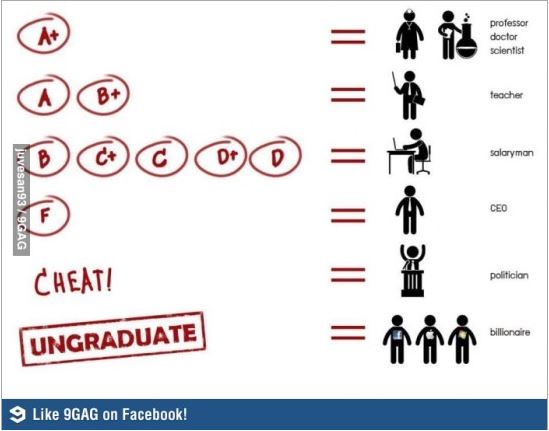 게시물은 A+학점은 교수 의사 과학자, A와 B+학점은 선생, B부터 D까지는 직장인으로 분류했다. F학점은 CEO, 부정행위자는 정치인, 중퇴의 경우는 억만장자라고 적어 웃음을 자아낸다.