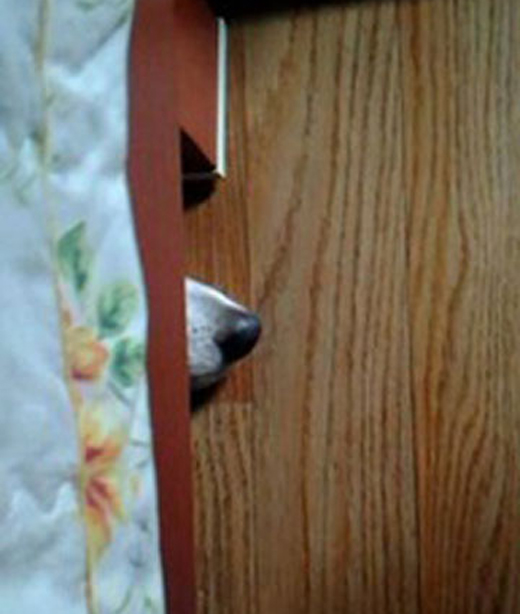해당 사진 속 침대 밑에는 개 한마리가 숨어있다. 코끝이 나와 있어 눈길을 끈다.