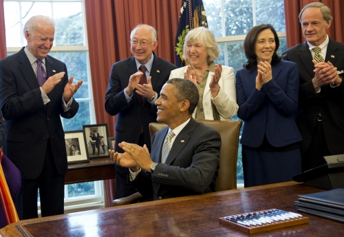 버락 오바마(가운데) 미국 대통령은 25일(현지시간) 백악관 집무실에서 생태학적 가치가 높은 5개 유적을 국립기념물로 지정하는 포고문에 서명했다. 이중 델라웨어주의 ‘퍼스트 스테이트’는 이 지역 출신인 조 바이든 부통령(왼쪽)이 추진하고 있는 델라웨어주 최초의 국립공원 지정을 위한 첫 단계다. 워싱턴/UPI연합뉴스