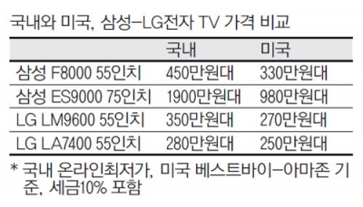 26일 관련업계에 따르면 삼성전자가 올해 전략모델로 선보인 55인치 ‘F8000’ 시리즈는 국내 온라인 쇼핑몰에서 최저가 450만원대에 팔리고 있다. 반면 미국 유통업체 베스트바이에서는 2699.99달러(약 300만원), 온라인 쇼핑몰 아마존 역시 2697.99달러(약 300만원) 정도에 판매되고 있다. 미국 시장에서 통상 10% 정도 붙는 세금을 고려해도 120만원 가까이 가격차이가 나고 있는 것.