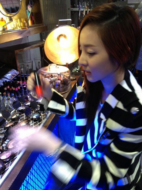 산다라박은 흰색과 검은색의 스트라이프 재킷을 걸치고 한 쪽으로 머리를 늘어트린채 화장품을 고르고 있다. 특히 수 많은 화장품 앞에서 눈길을 빼앗긴 채 이 것 저 것 테스트 해보고 있는 모습이 눈길을 끈다.