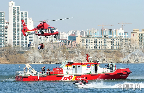 서울시 소방재난본부 소속 119특수구조단이 27일 오후 한강에서 유관기관 합동 수난사고 대응훈련을 실시하고 있다. 이번 훈련은 유람선이 돌풍으로 인해 수상시설물과 충돌 후, 화재가 발생해 승객 일부가 한강으로 투신하고 유람선의 유류탱크가 파손돼 유류가 급속히 확산되는 상황을 설정했다. 노진환 기자 myfixer@