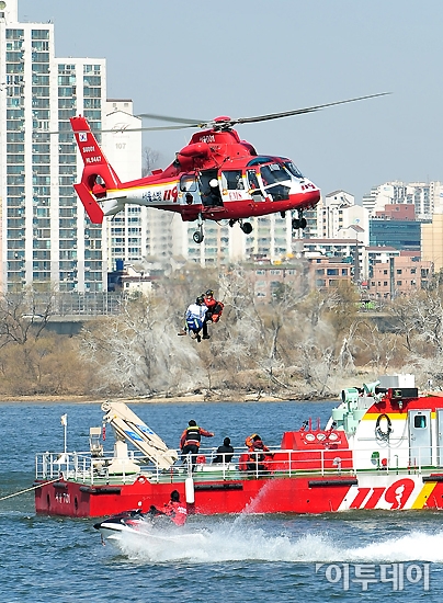 서울시 소방재난본부 소속 119특수구조단이 27일 오후 한강에서 유관기관 합동 수난사고 대응훈련을 실시하고 있다. 이번 훈련은 유람선이 돌풍으로 인해 수상시설물과 충돌 후, 화재가 발생해 승객 일부가 한강으로 투신하고 유람선의 유류탱크가 파손돼 유류가 급속히 확산되는 상황을 설정했다. 노진환 기자 myfixer@