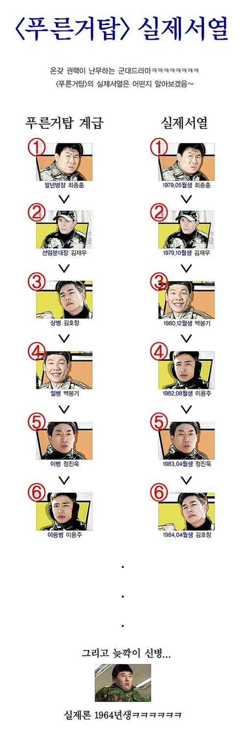 극중 서열 1·2위인 말년병장 최종훈과 분대장 김재우는 푸른거탑과 마찬가지로 실제 나이도 서열 1·2위로 나타났다.