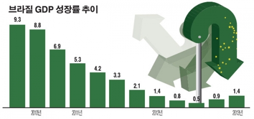 브라질의 경제성장률은 지난 2011~2012년 1.8%에 그쳤다. 이는 2004~2008년 평균인 4.8%에 크게 못 미치는 것이다.