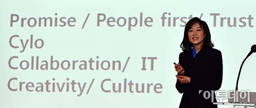 조윤선 여성가족부 장관이 28일 오전 서울 종로구 씨티은행 본점에서 열린 ‘세계여성의 날 기념 리더십 강연'에서 “첫 여성 대통령 시대, 변화의 시작”이란 주제로 강연을 하고 있다. 방인권 기자 bink119@