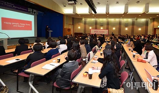 조윤선 여성가족부 장관이 28일 오전 서울 종로구 씨티은행 본점에서 열린 ‘세계여성의 날 기념 리더십 강연'에서 “첫 여성 대통령 시대, 변화의 시작”이란 주제로 강연을 하고 있다. 방인권 기자 bink119@