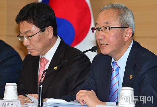 현오석 경제 부총리 겸 기획재정부 장관(오른쪽)과 경제 관련 부처 장관들이 28일 오후 서울 세종로 정부서울청사에서 박근혜 정부의 '2013년 경제정책방향‘에 대해 합동 브리핑'을 하고 있다. 방인권 기자 bink7119@