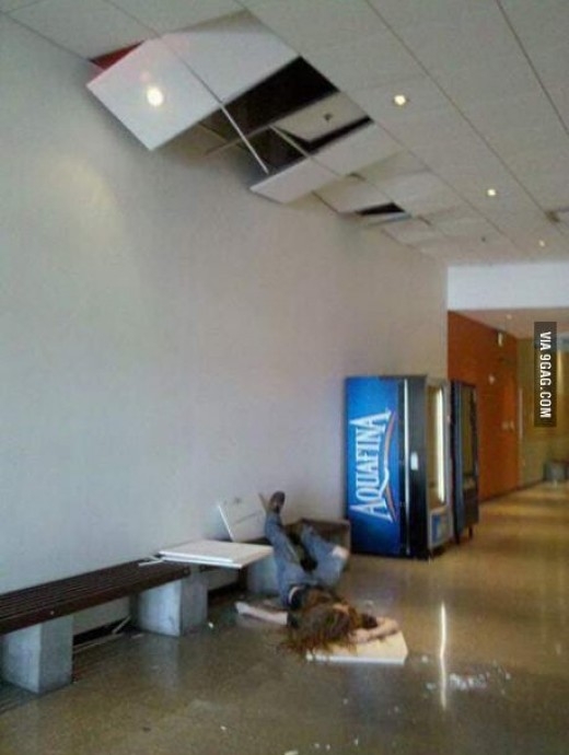 사진에는 한 남성이 복도에 쓰러져 있는 모습이 담겨 있다. 천장 판넬들이 부서져 있고 남자는 기절한 듯 쓰러진 모습을 보면 천장에서 떨어진 것으로 추측된다.
