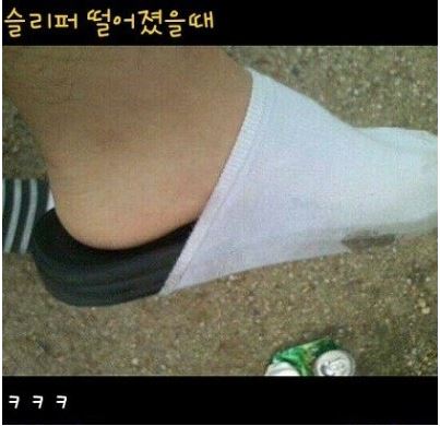 사진 속에는 슬리퍼 겉으로 양말을 신고 있는 발이 클로즈업돼 있다.