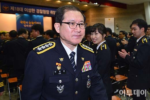 이성한 경찰청장이 29일 오후 서울 서대문구 미근동 경찰청에서 열린 ‘제 18대 경찰청장 취임식’에서 관계자들과 인사를 마친 뒤, 강당을 나서고 있다. 방인권 기자 bink7119@
