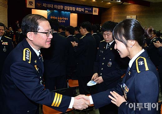 이성한 경찰청장이 29일 오후 서울 서대문구 미근동 경찰청에서 열린 ‘제 18대 경찰청장 취임식’에서 관계자들과 인사를 나누고 있다. 방인권 기자 bink7119@