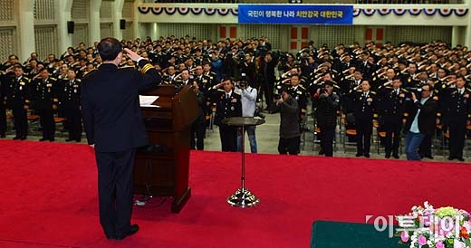 이성한 경찰청장이 29일 오후 서울 서대문구 미근동 경찰청에서 열린 ‘제 18대 경찰청장 취임식’에서 경찰수뇌부와 인사를 나누고 있다. 방인권 기자 bink7119@