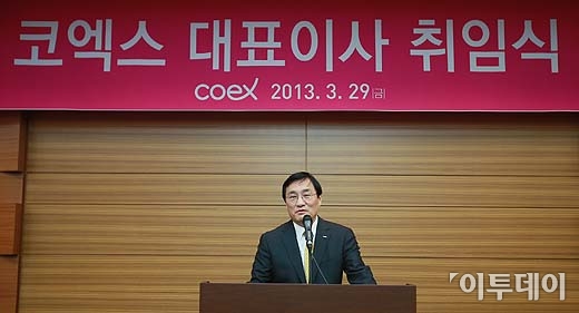 변보경 코엑스 신임 대표이사가 29일 서울 강남구 삼성동 코엑스에서 열린 취임식에서 취임사를 하고 있다. (코엑스 제공)