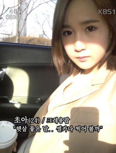 초아는 차안에 앉아 햇살을 받은 채 사진을 찍었다. 사진은 'KBS' 방송화면 처럼 꾸며주는 애플리케이션을 이용해 "햇살 좋으날... 셀카나 찍어볼까"라는 설명을 달았다.
