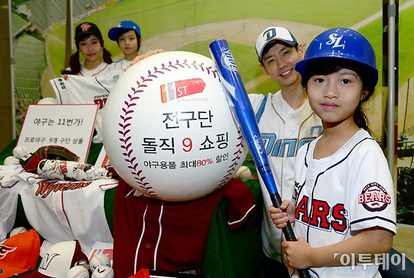 오프마켓 11번가가 2013년 프로야구 개막을 기념해 ‘돌직9쇼핑 베이스볼’ 프로모션을 진행한다. 31일 오전 서울 을지로 SK텔레콤 T타워에서 어린이와 모델들이 프로야구 9개 구단 상품과 야구 용품을 최대 80% 저렴하게 판매하는 행사를 알리고 있다. 노진환 기자 myfixer@