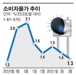 통계청이 1일 발표한 ‘2013년 3월 소비자물가동향’에 따르면 3월 소비자물가지수는 107.4로 전월보다 0.2% 하락했다. 전년 같은 기간보다는 1.3% 올라 2012년 11월의 1.6% 상승 이후 5개월 연속 1%대의 안정세를 보였다.