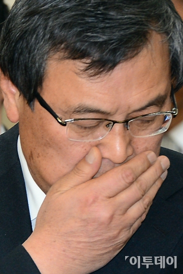 최문기 미래창조과학부 장관 후보자가 1일 오전 여의도 국회 미래창조과학방송통신위원회 전체회의에서 진행된 인사청문회에 참석해 입을 가리고 기침을 하고 있다. 노진환 기자 myfixer@