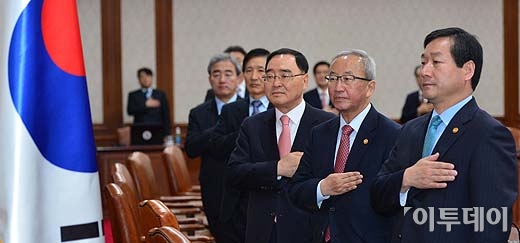 정홍원 국무총리(오른쪽 세번째)와 국무위원들이 2일 오전 서울 세종로 정부서울청사에서 열린 국무회의에서 국기에 대한 경례를 하고 있다. 방인권 기자 bink7119@