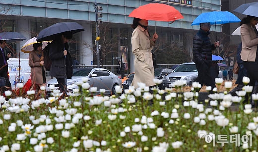 봄을 재촉하는 비가 내린 2일 서울 중구 청계광장에 핀 봄꽃 너머로 시민들이 출근길을 재촉하고 있다. 기상청은 이번 봄비가 지나가면 기온이 오를 것으로 전망했다. 양지웅 기자 yangdoo@