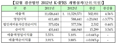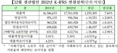연결재무제표를 제출한 12월 결산법인(562사) 중 63사를 제외한 499사를 대상으로 조사한 결과, 2012년 연결 매출액은 1776조원으로 전년 동기 대비 7.60% 증가했고 연결순이익, 지배기업 소유주지분 순이익은 각각 6.87%, 2.98% 감소했다.