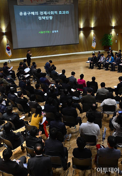 서울연구원 윤형호 실장이 2일 서울시청에서 열린 '희망기업 구매증대 및 계약제도 개선 청책토론회'에 참석해 발제를 하고 있다.