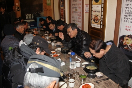 ▲서승환 국토교통부 장관이 지난 2일 오전 성남시 수정구 태평동 새벽인력 시장을 방문해 건설근로자들과 아침식사를 함께 하고 있다. (사진=국토교통부)