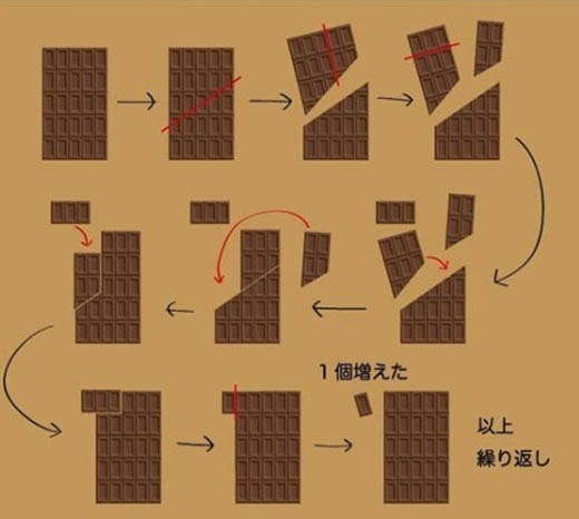 공개된 사진은 시중에 판매되고 있는 초콜릿이다. 쪼개고 잘라 제일 조그만 초콜릿 조각을 하나 남긴다는 내용이다. 설명대로 초콜릿을 잘라 끼워 맞추면 한 칸이 남아 눈길을 끈다.
